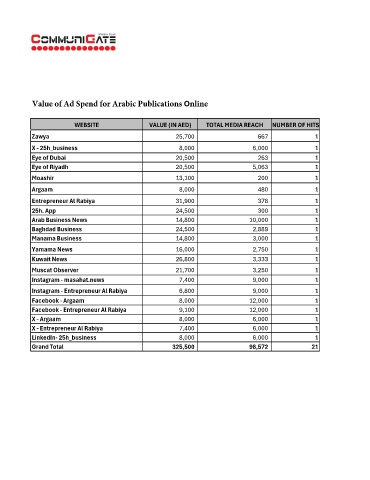 WEBSITE VALUE (IN AED) TOTAL MEDIA REACH NUMBER OF HITS