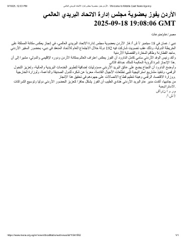 9/19/25, 12:03 PM ﻲﻣﻟﺎﻌﻟا يدﯾرﺑﻟا دﺎﺣﺗﻻا ةرادإ سﻠﺟﻣ ﺔﯾوﺿﻌﺑ زوﻔﯾ ندرﻷا - Welcome to Middle East News Agency