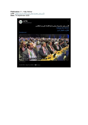 Publication: X – Hala Akhbar Link: يملاعلا يديربلا داحتلاا ةرادإ سلجم ةيوضعب زوفي ندرلأا Date: 19 September 2025