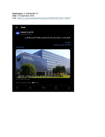 Publication: X- ENNAHAR TV Date: 19 September 2025 Link: https://x.com/ennaharonline/status/1968700513651728817