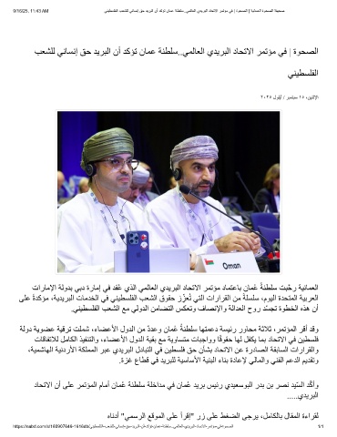 ﺐﻌﺸﻠﻟ ﻲﻧﺎﺴﻧإ ﻖﺣ ﺪﯾﺮﺒﻟا نأ ﺪﻛﺆﺗ نﺎﻤﻋ ﺔﻨﻄﻠﺳ..ﻲﻤﻟﺎﻌﻟا يﺪﯾﺮﺒﻟا دﺎﺤﺗﻻا ﺮﻤﺗﺆﻣ ﻲﻓ | ةﻮﺤﺼﻟا