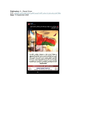Publication: X – Rassd Oman ُ Link: ينيطسلفلا بعشلا قوقحل ةمعادلا يملاعلا يديربلا داحتلاا رمتؤم تارارقب بّحرت نامُع ةنطلس Date: 16 September 2025