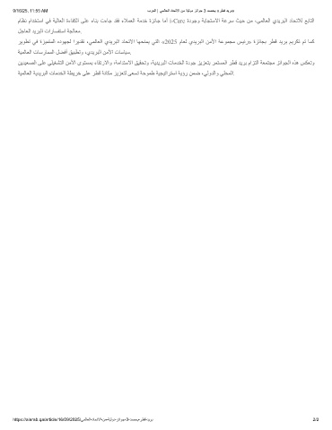 ﺮﯾﻮﻄﺗ ﻲﻓ ةﺰﯿﻤﺘﻤﻟا هدﻮﮭﺠﻟ اﺮﯾﺪﻘﺗ ،ﻲﻤﻟﺎﻌﻟا يﺪﯾﺮﺒﻟا دﺎﺤﺗﻻا ﺎﮭﺤﻨﻤﯾ ﻲﺘﻟا «2025 مﺎﻌﻟ يﺪﯾﺮﺒﻟا ﻦﻣﻷا ﺔﻋﻮﻤﺠﻣ ﺲﯿﺋر» ةﺰﺋﺎﺠﺑ ﺮﻄﻗ ﺪﯾﺮﺑ ﻢﯾﺮﻜﺗ ﻢﺗ ﺎﻤﻛ