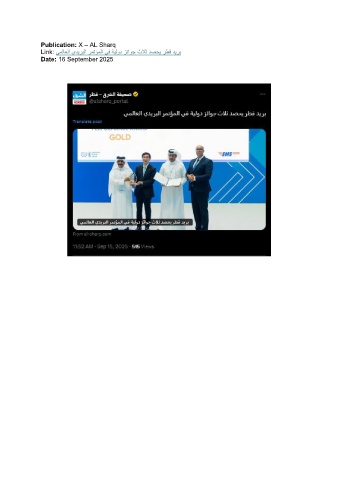 Publication: X – AL Sharq Link: يملاعلا يديربلا رمتؤملا يف ةيلود زئاوج ثلاث دصحي رطق ديرب Date: 16 September 2025
