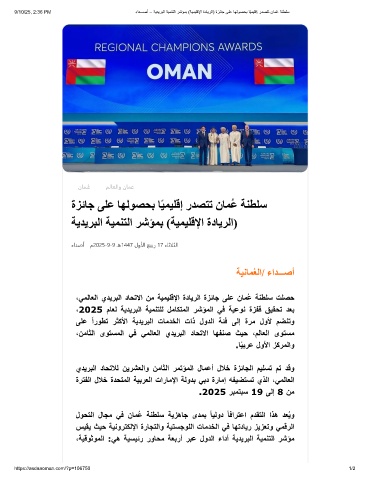 ،ﻲﻣﻟﺎﻌﻟا يدﯾرﺑﻟا دﺎﺣﺗﻻا نﻣ ﺔﯾﻣﯾﻠﻗﻹا ةدﺎﯾرﻟا ةزﺋﺎﺟ ﻰﻠﻋ نﺎﻣُﻋ ﺔﻧطﻠﺳ تﻠﺻﺣ