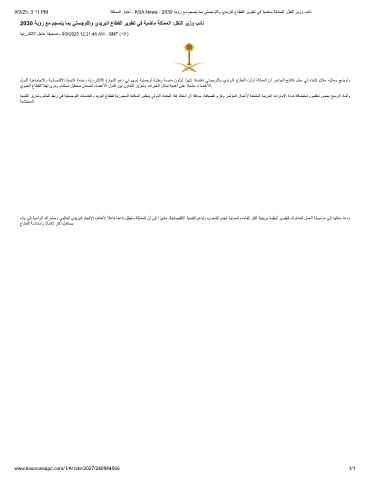 9/9/25, 3:11 PM ﺔﻛﻠﻣﻣﻟا رﺎﺑﺧأ - KSA News - 2030 ﺔﯾؤر ﻊﻣ مﺟﺳﻧﯾ ﺎﻣﺑ ﻲﺗﺳﺟوﻠﻟاو يدﯾرﺑﻟا عﺎطﻘﻟا رﯾوطﺗ ﻲﻓ ﺔﯾﺿﺎﻣ ﺔﻛﻠﻣﻣﻟا :لﻘﻧﻟا رﯾزو بﺋﺎﻧ