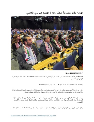 ديربلا ةكرشل نايب بسحبو ،ةلود 192 هب كراش تيوصتب كلذو ،يملاعلا يديربلا داحتلاا ةرادإ سلجم ةيوضعب ندرلأا زاف - ةنسوسلا