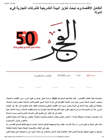 12/5/25, 7:59 AM ﺔﻟودﻟا ﻲﻓ ﺔﯾرﺎﺟﺗﻟا تﺎﻛرﺷﻠﻟ ﺔﯾﻌﯾرﺷﺗﻟا ﺔﺋﯾﺑﻟا زﯾزﻌﺗ ثﺣﺑﺗ «يدﺎﺻﺗﻗﻻا لﻣﺎﻛﺗﻟا» | ﮫﯾﺗارﺎﻣﻹا رﺟﻔﻟا ةدﯾرﺟ | ﮫﯾﺗارﺎﻣﻹا رﺟﻔﻟا ةدﯾرﺟ