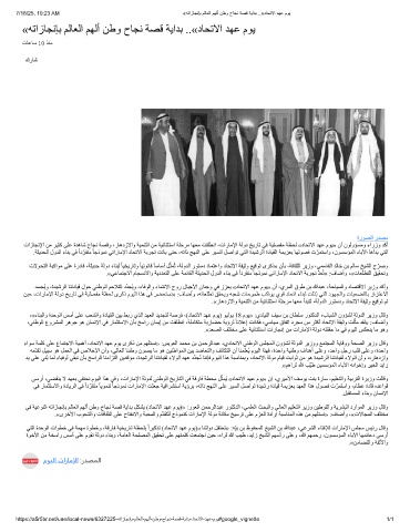 ﻦﯿﺣ ،تارﺎﻣﻹا ﺔﻟود ﺦﯾرﺎﺗ ﻲﻓ ﺔﯿﻠﺼﻔﻣ ﺔﻈﺤﻟ ىﺮﻛذ مﻮﯿﻟا اﺬھ ﻲﻓ ﺮﻀﺤﺘﺴﻧ» :فﺎﺿأو ،ﮫﺗﺎﻌﻠﻄﺗ ﻖﻘﺤﯾو ﮫﺒﻌﺷ تﺎﺣﻮﻤط ﺐﻛاﻮﯾ يﻮﻗ دﺎﺤﺗا ءﺎﻨﺒﻟ ﺖﻟﺬُﺑ ﻲﺘﻟا دﻮﮭﺠﻟاو تﺎﯿﺤﻀﺘﻟﺎﺑ زاﺰﺘﻋﻻا
