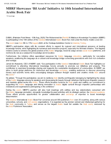 8/14/25, 10:03 AM MBRF Showcases ‘Bil Arabi’ Initiative At 10th Istanbul International Arabic Book Fair | Pakistan Point