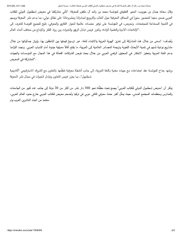 8/14/25, 9:11 AM نطوﻟا ةدﯾرﺟ › ةرﺷﺎﻌﻟا ﮫﺗﺧﺳﻧﺑ ﻲﺑرﻌﻟا بﺎﺗﻛﻠﻟ ﻲﻟودﻟا لوﺑﻧطﺳإ ضرﻌﻣ ﻲﻓ كرﺎﺷﺗ ﺔﻓرﻌﻣﻠﻟ موﺗﻛﻣ لآ دﺷار نﺑ دﻣﺣﻣ ﺔﺳﱠﺳؤﻣ