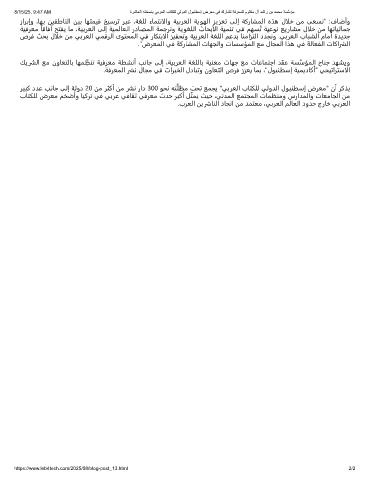 8/15/25, 9:47 AM ةرﺷﺎﻌﻟا ﮫﺗﺧﺳﻧﺑ ﻲﺑرﻌﻟا بﺎﺗﻛﻠﻟ ﻲﻟودﻟا لوﺑﻧطﺳإ ضرﻌﻣ ﻲﻓ كرﺎﺷﺗ ﺔﻓرﻌﻣﻠﻟ موﺗﻛﻣ لآ دﺷار نﺑ دﻣﺣﻣ ﺔﺳﱠﺳؤﻣ