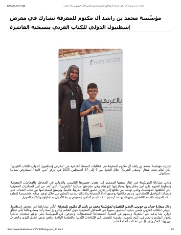 8/15/25, 9:47 AM ةرﺷﺎﻌﻟا ﮫﺗﺧﺳﻧﺑ ﻲﺑرﻌﻟا بﺎﺗﻛﻠﻟ ﻲﻟودﻟا لوﺑﻧطﺳإ ضرﻌﻣ ﻲﻓ كرﺎﺷﺗ ﺔﻓرﻌﻣﻠﻟ موﺗﻛﻣ لآ دﺷار نﺑ دﻣﺣﻣ ﺔﺳﱠﺳؤﻣ