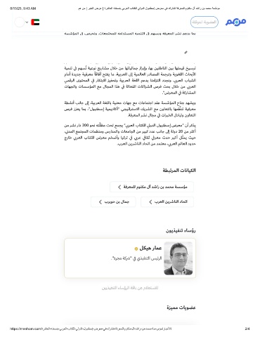 8/15/25, 9:43 AM مھ نﻣ | رﺑﺧﻟا ضرﻋ | ةرﺷﺎﻌﻟا ﮫﺗﺧﺳﻧﺑ ﻲﺑرﻌﻟا بﺎﺗﻛﻠﻟ ﻲﻟودﻟا لوﺑﻧطﺳإ ضرﻌﻣ ﻲﻓ كرﺎﺷﺗ ﺔﻓرﻌﻣﻠﻟ موﺗﻛﻣ لآ دﺷار نﺑ دﻣﺣﻣ ﺔﺳﱠﺳؤﻣ
