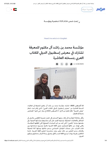 8/15/25, 9:43 AM مھ نﻣ | رﺑﺧﻟا ضرﻋ | ةرﺷﺎﻌﻟا ﮫﺗﺧﺳﻧﺑ ﻲﺑرﻌﻟا بﺎﺗﻛﻠﻟ ﻲﻟودﻟا لوﺑﻧطﺳإ ضرﻌﻣ ﻲﻓ كرﺎﺷﺗ ﺔﻓرﻌﻣﻠﻟ موﺗﻛﻣ لآ دﺷار نﺑ دﻣﺣﻣ ﺔﺳﱠﺳؤﻣ