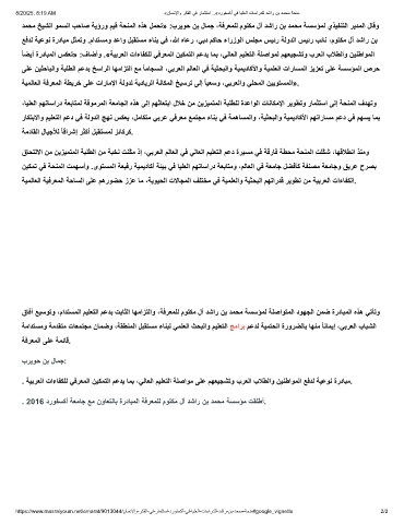 ًﺎﺿﯾأ ةردﺎﺑﻣﻟا سﻛﻌﺗ» :فﺎﺿأو .«ﺔﯾﺑرﻌﻟا تاءﺎﻔﻛﻠﻟ ﻲﻓرﻌﻣﻟا نﯾﻛﻣﺗﻟا مﻋدﯾ ﺎﻣﺑ ،ﻲﻟﺎﻌﻟا مﯾﻠﻌﺗﻟا ﺔﻠﺻاوﻣﻟ مﮭﻌﯾﺟﺷﺗو برﻌﻟا بﻼطﻟاو نﯾﻧطاوﻣﻟا