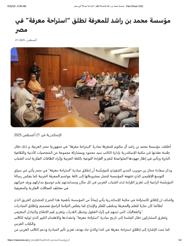 8/22/25, 9:08 AM رﺻﻣ ﻲﻓ "ﺔﻓرﻌﻣ ﺔﺣارﺗﺳا" ﻖﻠطﺗ ﺔﻓرﻌﻣﻠﻟ دﺷار نﺑ دﻣﺣﻣ ﺔﺳﺳؤﻣ - Nas News UAE