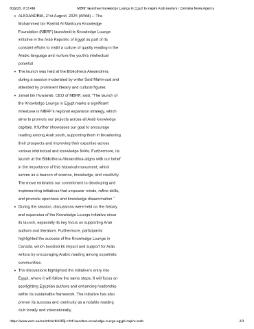 8/22/25, 9:53 AM MBRF launches Knowledge Lounge in Egypt to inspire Arab readers | Emirates News Agency