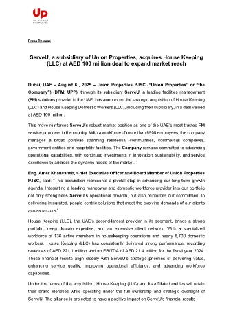 ServeU, a subsidiary of Union Properties, acquires House Keeping