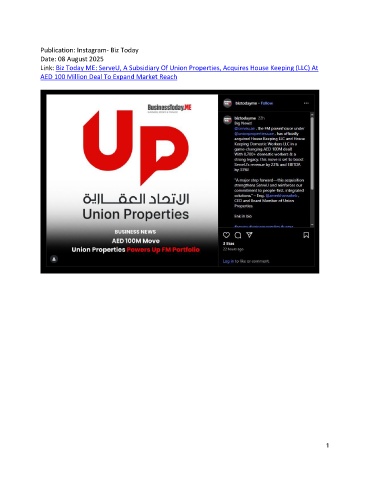 Publication: Instagram- Biz Today Date: 08 August 2025 Link: Biz Today ME: ServeU, A Subsidiary Of Union Properties, Acquires House Keeping (LLC) At AED 100 Million Deal To Expand Market Reach 1