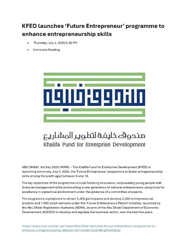 ABU DHABI, 3rd July 2025 (WAM) -- The Khalifa Fund for Enterprise Development (KFED) is