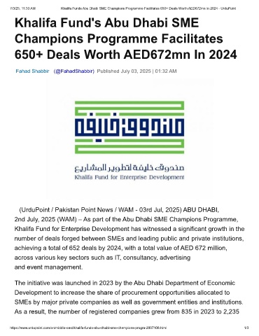 7/3/25, 11:33 AM Khalifa Funds Abu Dhabi SME Champions Programme Facilitates 650+ Deals Worth AED672mn In 2024 - UrduPoint