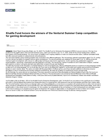 7/22/25, 2:12 PM Khalifa Fund honors the winners of the Venturist Summer Camp competition for gaming development