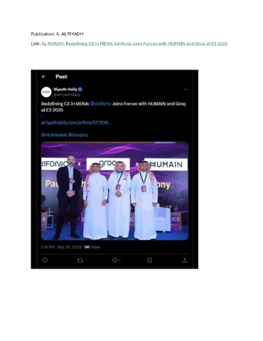 Publication: X- AL RIYADH Link: AL RIYADH: Redefining CX in MENA: Unifonic joins Forces with HUMAIN and Groq at E3 2025