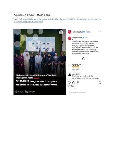 Publication: INSTAGRAM – MEDIA OFFICE Link: Mohamed bin Zayed University of Artificial Intelligence hosts 3rd Mailis programme to explore AI’s role in shaping future of work