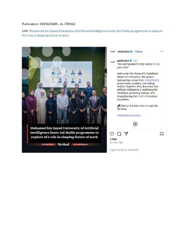 Publication: INSTAGRAM – AL ETIHAD Link: Mohamed bin Zayed University of Artificial Intelligence hosts 3rd Mailis programme to explore AI’s role in shaping future of work