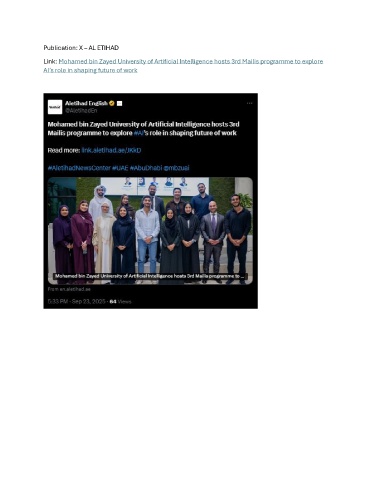 Publication: X – AL ETIHAD Link: Mohamed bin Zayed University of Artificial Intelligence hosts 3rd Mailis programme to explore AI’s role in shaping future of work