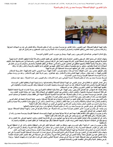 ﺎﮭﺟﻮﻣ ،ﺔﻓﺎﺤﺼﻠﻟ ﺔﯿﻨطﻮﻟا ﺔﺌﯿﮭﻟاو ،ﺮﺼﻣ ﻲﻓ ﺪﺟاﻮﺘﻟﺎﺑ ﮫﺗدﺎﻌﺳ ﻦﻋ ،ﺔﻓﺮﻌﻤﻠﻟ ﺪﺷار ﻦﺑ ﺪﻤﺤﻣ ﺔﺴﺳﺆﻤﻟ يﺬﯿﻔﻨﺘﻟا ﺮﯾﺪﻤﻟا ،بﺮﯾﻮﺣ ﻦﺑ لﺎﻤﺟ ﺮﺒﻋ ،ﮫﺒﻧﺎﺟ ﻦﻣو