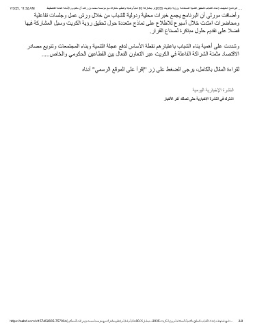7/3/25, 11:32 AM طﯾطﺧﺗﻠﻟ ﺔﻣﺎﻌﻟا ﺔﻧﺎﻣﻷاو موﺗﻛﻣ لآ دﺷار نﺑ دﻣﺣﻣ ﺔﺳﺳؤﻣ ﻊﻣ كرﺗﺷﻣ مﯾظﻧﺗو ﺔﺑﺎﺷو ً ﺎﺑﺎﺷ 60 ﺔﻛرﺎﺷﻣﺑ .«2035 تﯾوﻛ» ﺔﯾؤرو ﺔﻣادﺗﺳﻣﻟا ﺔﯾﻣﻧﺗﻟا ﻖﯾﻘﺣﺗﻟ بﺎﺑﺷﻟا دادﻋإ فدﮭﺗﺳا ﺞﻣﺎﻧرﺑﻟا .…