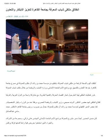 7/22/25, 10:56 AM 24 تارﺎﻣﻹا | نوﺎﻌﺗﻟاو رﺎﻛﺗﺑﻻا زﯾزﻌﺗﻟ ةرھﺎﻘﻟا ﺔﻌﻣﺎﺟﺑ ﺔﻓرﻌﻣﻟا بﺎﺑﺷ ﻰﻘﺗﻠﻣ قﻼطﻧا