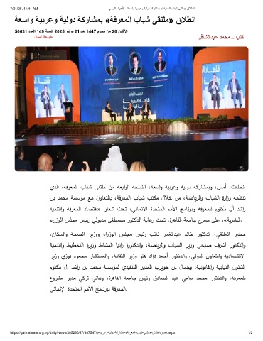 7/21/25, 11:41 AM ﻲﻣوﯾﻟا مارھﻷا - ﺔﻌﺳاو ﺔﯾﺑرﻋو ﺔﯾﻟود ﺔﻛرﺎﺷﻣﺑ «ﺔﻓرﻌﻣﻟا بﺎﺑﺷ ﻰﻘﺗﻠﻣ» قﻼطﻧا
