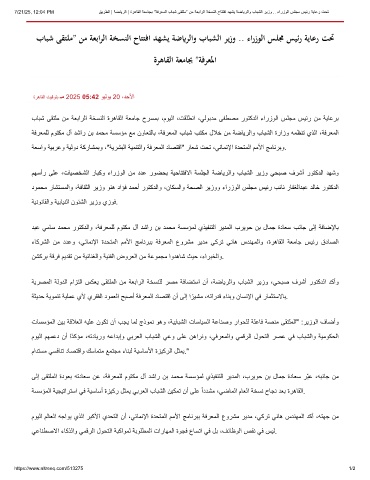 7/21/25, 12:04 PM ﻖﯾرطﻟا | ﺔﺿﺎﯾرﻟا | ةرھﺎﻘﻟا ﺔﻌﻣﺎﺟﺑ ”ﺔﻓرﻌﻣﻟا بﺎﺑﺷ ﻰﻘﺗﻠﻣ” نﻣ ﺔﻌﺑارﻟا ﺔﺧﺳﻧﻟا حﺎﺗﺗﻓا دﮭﺷﯾ ﺔﺿﺎﯾرﻟاو بﺎﺑﺷﻟا رﯾزو .. ءارزوﻟا سﻠﺟﻣ سﯾﺋر ﺔﯾﺎﻋر تﺣﺗ