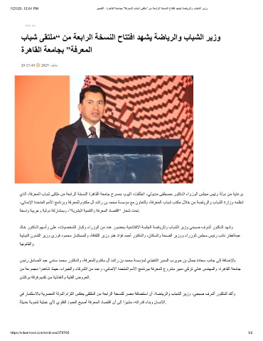7/21/25, 12:04 PM رﯾﻣﻌﺗﻟا - ةرھﺎﻘﻟا ﺔﻌﻣﺎﺟﺑ "ﺔﻓرﻌﻣﻟا بﺎﺑﺷ ﻰﻘﺗﻠﻣ" نﻣ ﺔﻌﺑارﻟا ﺔﺧﺳﻧﻟا حﺎﺗﺗﻓا دﮭﺷﯾ ﺔﺿﺎﯾرﻟاو بﺎﺑﺷﻟا رﯾزو