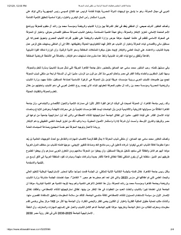 ﻰﻟإ ﮫﺗاروﺻﺗ لﯾوﺣﺗو يرﺻﻣﻟا بﺎﺑﺷﻟا تاردﻗ رﯾوطﺗ ﻲﻠﻋ ﺔﺿﺎﯾرﻟاو بﺎﺑﺷﻟا ةرازو صرﺣ اًدﻛؤﻣ ،ثﯾدﺣﻟا ﺎﻧﻣﻟﺎﻋ ﻲﻓ مدﻘﺗﻠﻟ ﻲﺳﺎﺳﻷا كرﺣﻣﻟا ﻲھ