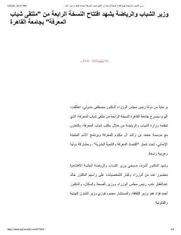 7/21/25, 12:07 PM 24 زوﯾﻧ | ةرھﺎﻘﻟا ﺔﻌﻣﺎﺟﺑ "ﺔﻓرﻌﻣﻟا بﺎﺑﺷ ﻰﻘﺗﻠﻣ" نﻣ ﺔﻌﺑارﻟا ﺔﺧﺳﻧﻟا حﺎﺗﺗﻓا دﮭﺷﯾ ﺔﺿﺎﯾرﻟاو بﺎﺑﺷﻟا رﯾزو