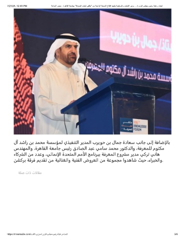 7/21/25, 12:49 PM ﺔﻋﺎﺳﻟا رﺻﻣ - ةرھﺎﻘﻟا ﺔﻌﻣﺎﺟﺑ ”ﺔﻓرﻌﻣﻟا بﺎﺑﺷ ﻰﻘﺗﻠﻣ“ نﻣ ﺔﻌﺑارﻟا ﺔﺧﺳﻧﻟا حﺎﺗﺗﻓا دﮭﺷﯾ ﺔﺿﺎﯾرﻟاو بﺎﺑﺷﻟا رﯾزو .. ءارزوﻟا سﻠﺟﻣ سﯾﺋر ﺔﯾﺎﻋر تﺣﺗ