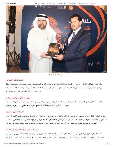 ،يﺮﺼﻤﻟا ﺔﻓﺮﻌﻤﻟا بﺎﺒﺷ ﺐﺘﻜﻣ ﺮﯾﺪﻣ ،دﺎﻤﻋ ﻲﺤﺘﻓ ﺪﯿﺴﻟا ﺎھرادأ ﻲﺘﻟاو ،”ﺔﻓﺮﻌﻤﻟا دﺎﺼﺘﻗا ﺮﺼﻋ ﻲﻓ ﺔﯾﻮﻤﻨﺗ تﺎﺳﺎﯿﺳ ﺔﻏﺎﯿﺻ“ ناﻮﻨﻌﺑ ﺔﯿﻧﺎﺜﻟا ﺔﺴﻠﺠﻟا ﺎﮭﺘﻠﺗ