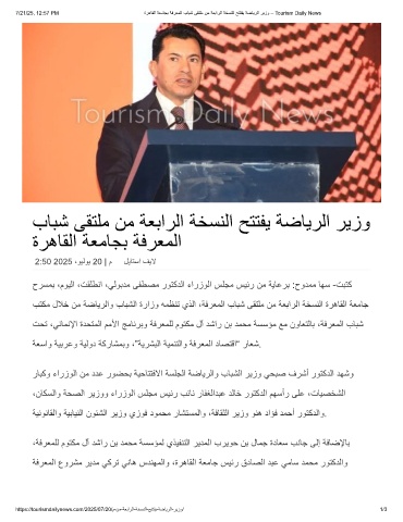 7/21/25, 12:57 PM ةرھﺎﻘﻟا ﺔﻌﻣﺎﺟﺑ ﺔﻓرﻌﻣﻟا بﺎﺑﺷ ﻰﻘﺗﻠﻣ نﻣ ﺔﻌﺑارﻟا ﺔﺧﺳﻧﻟا ﺢﺗﺗﻔﯾ ﺔﺿﺎﯾرﻟا رﯾزو – Tourism Daily News
