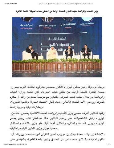 7/21/25, 12:59 PM رﻣﺣأ طﺧ | ﺔﺿﺎﯾر | ةرھﺎﻘﻟا ﺔﻌﻣﺎﺟﺑ ”ﺔﻓرﻌﻣﻟا بﺎﺑﺷ ﻰﻘﺗﻠﻣ” نﻣ ﺔﻌﺑارﻟا ﺔﺧﺳﻧﻟا حﺎﺗﺗﻓا دﮭﺷﯾ ﺔﺿﺎﯾرﻟاو بﺎﺑﺷﻟا رﯾزو