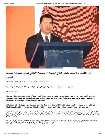7/21/25, 1:00 PM ﺔﯾرﺎﺑﺧﻻا ةدﯾرﺟ - ةرھﺎﻘﻟا ﺔﻌﻣﺎﺟﺑ "ﺔﻓرﻌﻣﻟا بﺎﺑﺷ ﻰﻘﺗﻠﻣ" نﻣ ﺔﻌﺑارﻟا ﺔﺧﺳﻧﻟا حﺎﺗﺗﻓا دﮭﺷﯾ ﺔﺿﺎﯾرﻟاو بﺎﺑﺷﻟا رﯾزو