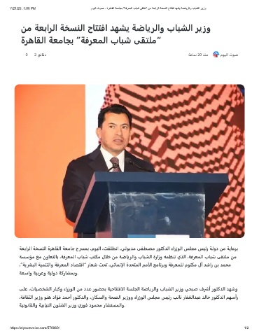 7/21/25, 1:00 PM موﯾﻟا توﺻ - ةرھﺎﻘﻟا ﺔﻌﻣﺎﺟﺑ "ﺔﻓرﻌﻣﻟا بﺎﺑﺷ ﻰﻘﺗﻠﻣ" نﻣ ﺔﻌﺑارﻟا ﺔﺧﺳﻧﻟا حﺎﺗﺗﻓا دﮭﺷﯾ ﺔﺿﺎﯾرﻟاو بﺎﺑﺷﻟا رﯾزو