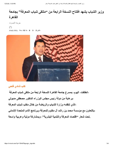 7/21/25, 1:03 PM مﺎﺟﺑ "ﺔﻓرﻌﻣﻟا بﺎﺑﺷ ﻰﻘﺗﻠﻣ" نﻣ ﺔﻌﺑارﻟا ﺔﺧﺳﻧﻟا حﺎﺗﺗﻓا دﮭﺷﯾ ﺔﺿﺎﯾرﻟاو بﺎﺑﺷﻟا رﯾزو