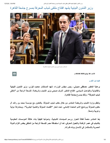 7/21/25, 1:04 PM ﻰﻧﺎﻣﻟرﺑ | ةرھﺎﻘﻟا ﺔﻌﻣﺎﺟ حرﺳﻣﺑ ﺔﻓرﻌﻣﻟا بﺎﺑﺷ ﻰﻘﺗﻠﻣ حﺎﺗﺗﻓا دﮭﺷﯾ ﺔﯾﺑﺎﯾﻧﻟا نوﺋﺷﻟا رﯾزو