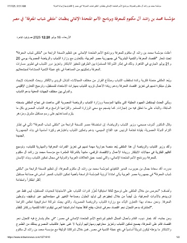 7/17/25, 9:51 AM ﺔﻟودﻟا ﺔﺑاوﺑ | ﺎﯾﺟوﻟوﻧﻛﺗﻟا | رﺻﻣ ﻲﻓ ”ﺔﻓرﻌﻣﻟا بﺎﺑﺷ ﻰﻘﺗﻠﻣ” نﺎﻣظﻧﯾ ﻲﺋﺎﻣﻧﻹا ةدﺣﺗﻣﻟا مﻣﻷا ﺞﻣﺎﻧرﺑو ﺔﻓرﻌﻣﻠﻟ موﺗﻛﻣ لآ دﺷار نﺑ دﻣﺣﻣ ﺔﺳﱠﺳؤﻣ