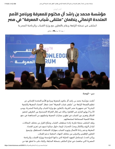 7/16/25, 9:52 AM رﺻﻣ ﻲﻓ "ﺔﻓرﻌﻣﻟا بﺎﺑﺷ ﻰﻘﺗﻠﻣ" نﺎﻣظﻧﯾ ﻲﺋﺎﻣﻧﻹا ةدﺣﺗﻣﻟا مﻣﻷا ﺞﻣﺎﻧرﺑو ﺔﻓرﻌﻣﻠﻟ موﺗﻛﻣ لآ دﺷار نﺑ دﻣﺣﻣ ﺔﺳﱠﺳؤﻣ