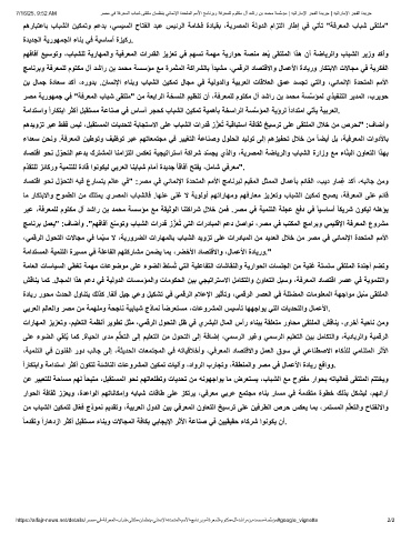 مﮭﻗﺎﻓآ ﻊﯾﺳوﺗو ،بﺎﺑﺷﻠﻟ ﺔﯾرﺎﮭﻣﻟاو ﺔﯾﻓرﻌﻣﻟا تاردﻘﻟا زﯾزﻌﺗ ﻲﻓ مﮭﺳﺗ ﺔﻣﮭﻣ ﺔﯾراوﺣ ﺔﺻﻧﻣ دﻌُﯾ ﻰﻘﺗﻠﻣﻟا اذھ نأ ﺔﺿﺎﯾرﻟاو بﺎﺑﺷﻟا رﯾزو دﻛأو